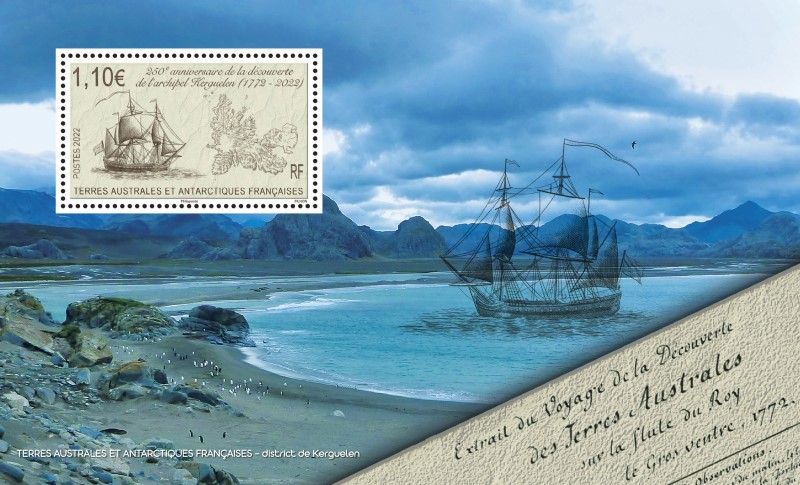 ème anniversaire de la découverte de l’archipel Kerguelen en 1772, 2022 (création et gravure de Line Filhon) (© TAAF / L. Filhon)