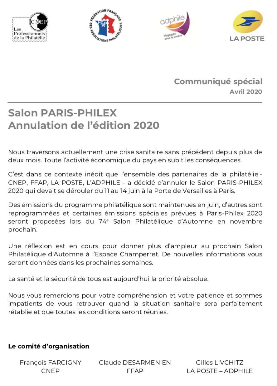 Vous pouvez télécharger le communiqué spécial d’avril 2020 : Communiqué spécial Paris Philex 2020