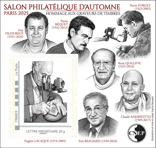 – Exposition du peintre-sculpteur Cyril de La Patellière en hommage aux artistes du timbre disparus : Marc Taraskoff (1955-2015), Claude Andréotto (1949-2017), Louis Briat (1938-2021), Jean-Paul Véret-Lemarinier (1944-2021), Yves Beaujard (1939-2024), Guy Vigoureux (1951-2024), Pierre-André Cousin (1956-2025).