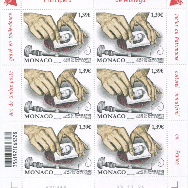 Ce timbre créé par Pierre Albuisson à 1,39 €, série artistique, est disponible sur le stand de l’Office des Emissions de Timbres-poste de Monaco. Vous remarquerez sur le bord de feuille la mention : « Art du timbre-poste gravé en taille-douce inclus au Patrimoine culturel immatériel en France. »