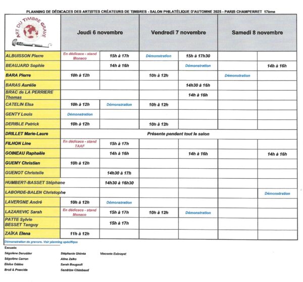 Vous pouvez télécharger le planning des démonstrations de graveurs de timbres : Démonstrations de gravure Salon d’Automne 2025