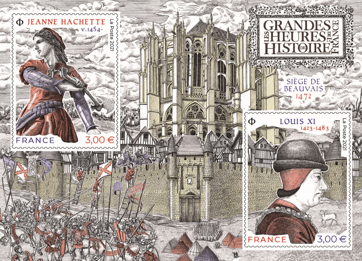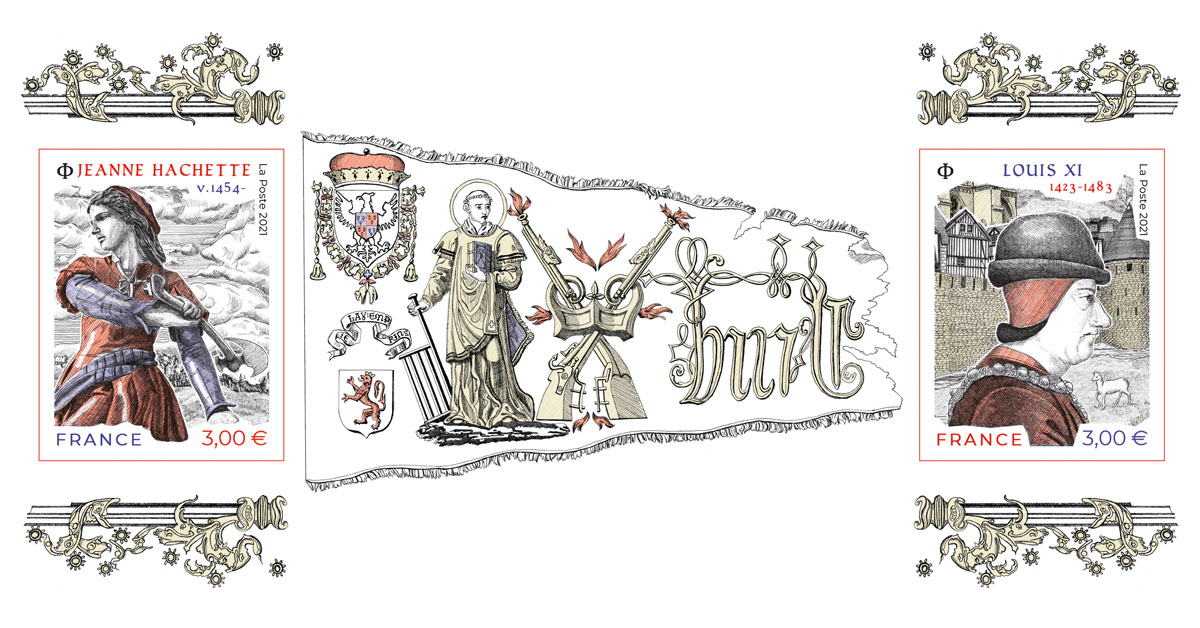 timbre Portrait de Louis XI, par Louis Boudan, (c) BnF, Dist. RMN-Grand Palais /image BnF, fond de bloc (c) Collection du réseau des médiathèques du Beauvaisis)