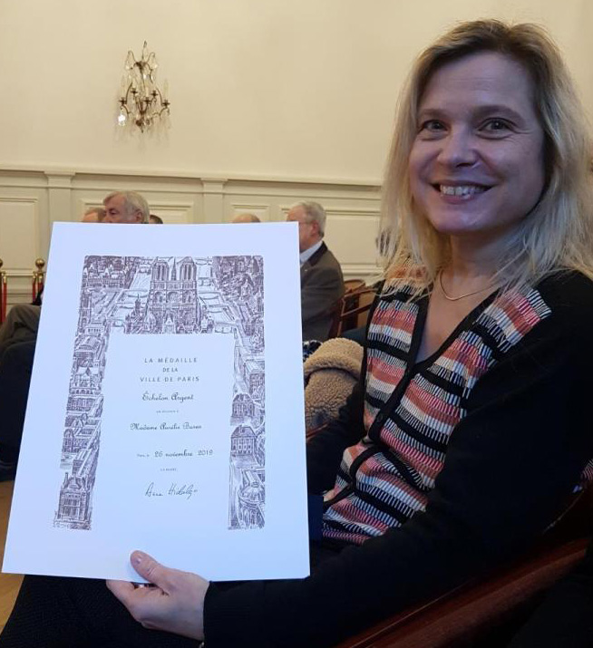 Aurélie Baras présente le diplôme de la médaille de la ville de Paris qu’elle reçoit le 4 décembre 2019 dans la salle du conseil de la mairie du 9ème arrondissement (© ATG / LF)