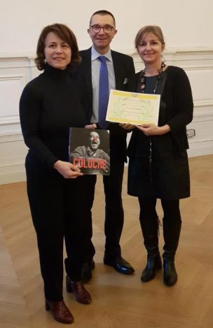 Sophie Beaujard reçoit le grand prix de l’art philatélique 2019 pour sa création artistique du timbre « Montpellier ». François Farcigny, président de la Cnep et Delphine Bürkli, maire du 9ème arrondissement de Paris remettent le prix dans la salle du conseil de la mairie (© ATG / LF)