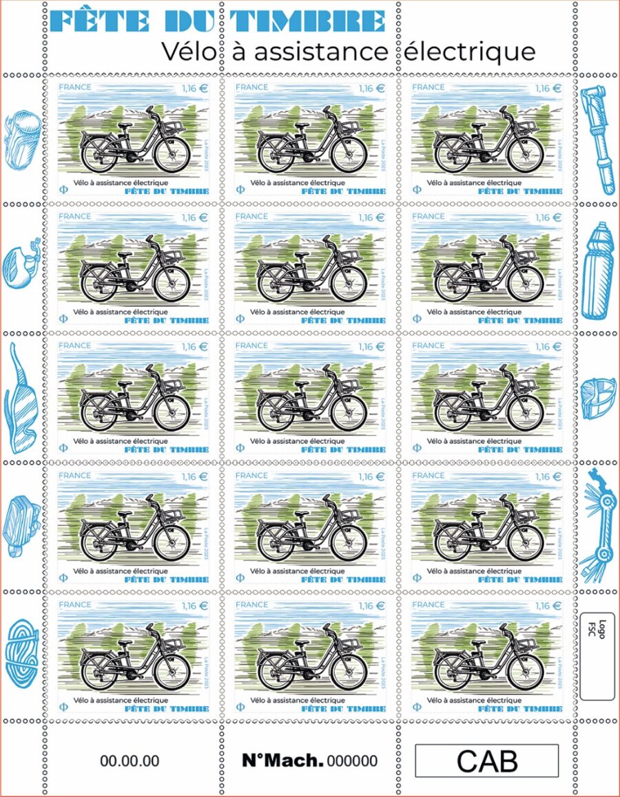Fête du Timbre 2023 : le vélo à assistance électrique, feuille de 15 timbres (création et gravure de Christophe Laborde-Balen d’après photos de © T.Vollaire. © Gitane) (© La Poste / C. Laborde-Balen)