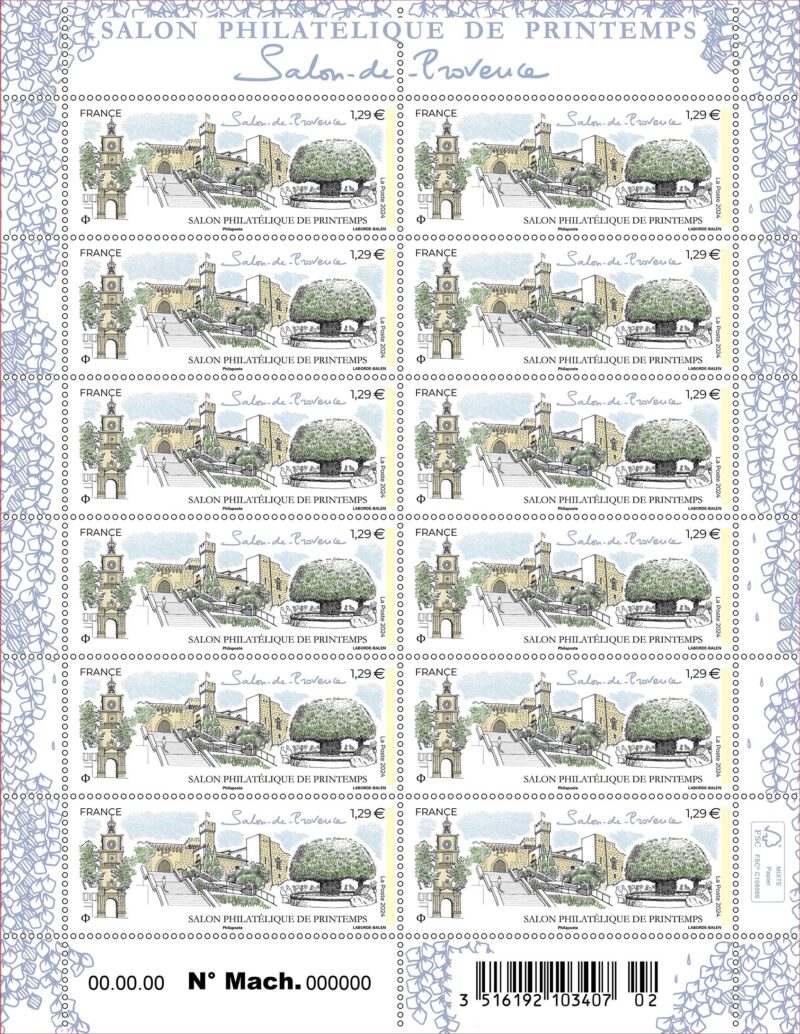 Salon-de-Provence, feuille de 12 timbres, 2024 (création et gravure de Christophe Laborde-Balen d’après photos © Ville de Salon-de-Provence, impression taille-douce) (© La Poste / C. Laborde-Balen)