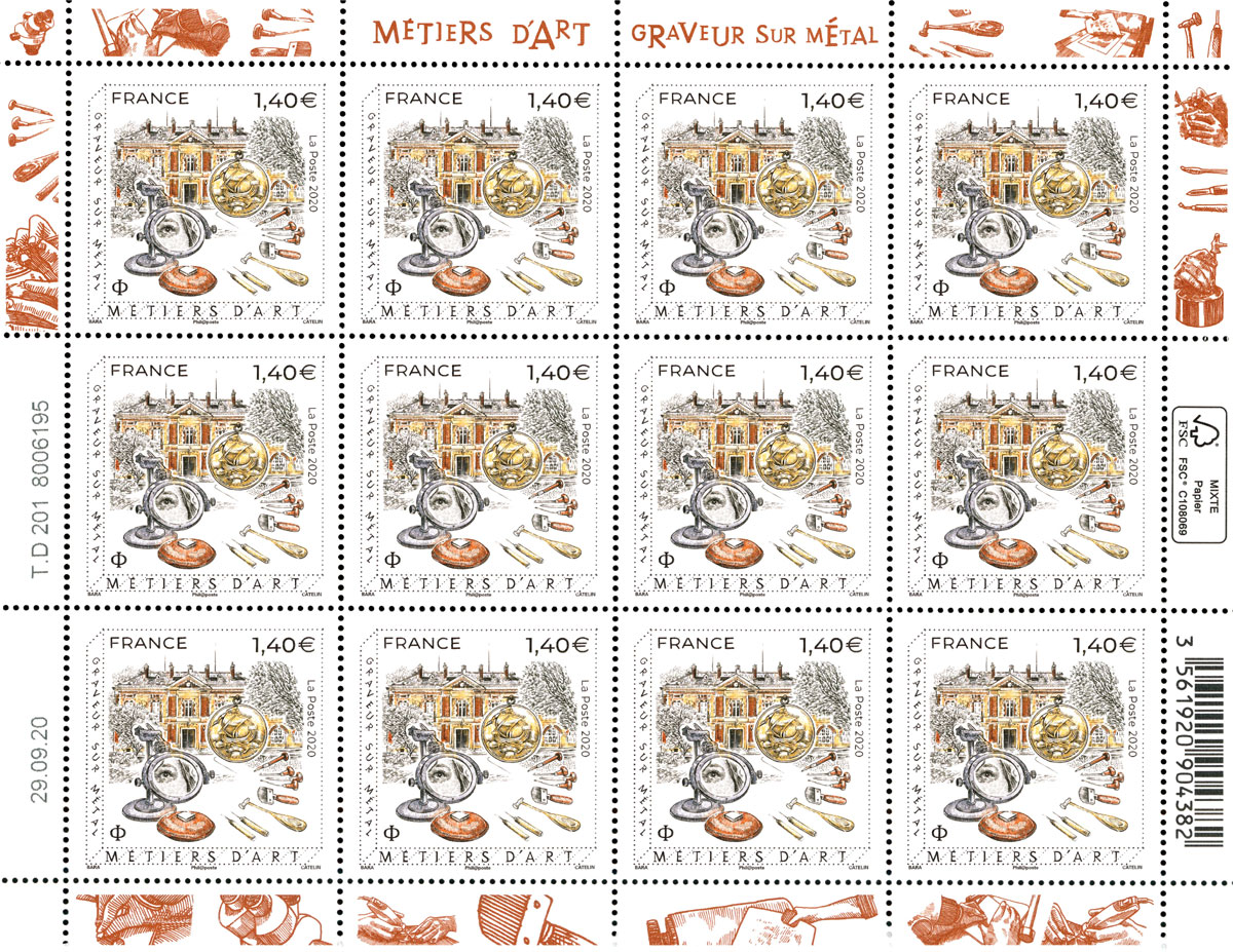 Métiers d’art : graveur sur métal, feuillet de 12 timbres, 2020 (création de Pierre Bara d’après photo Jacques Loïc photononstop, gravure d’Elsa Catelin, impression taille-douce) (© La Poste / P. Bara / E. Catelin)