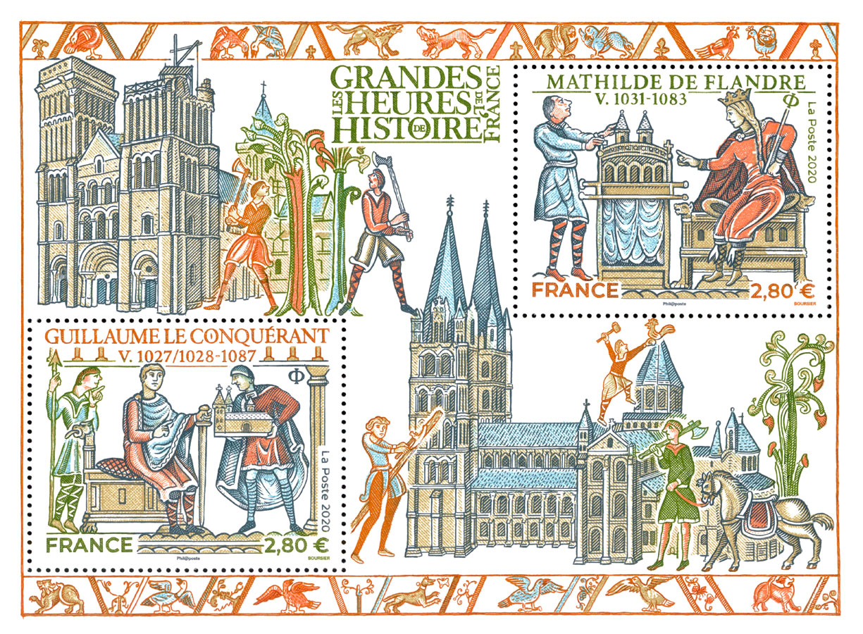 Les grandes heures de l’Histoire de France : Mathilde de Flandre – Guillaume le Conquérant, bloc-feuillet de deux timbres, 2020 (création et gravure de Louis Boursier, impression taille-douce, d’après photo Église de la Trinité de l’Abbaye aux Dames, Caen, les frères Neurdein, ENSBA. Estampe de l’histoire de Guillaume le Conquérant représentée sur une tapisserie, dite tapisserie de la reine Mathilde, musée de Bayeux, BNF, département Estampes et photographies, dessin de la vue de l’église de l’abbaye Saint-Etienne de Caen, Louis Boudan, 1702, recueil Topographique de la France, département du Calvados. Fonds Gaignières 5084, département Estampes et photographies, BNF) (© La Poste / L. Boursier)