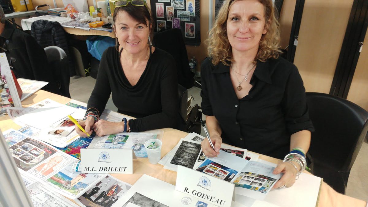 Les deux artistes Marie-Laure Drillet et Raphaële Goineau sur le stand de l’ATG, Salon philatélique d’automne, 2021 (© ATG / G. Toulemonde)