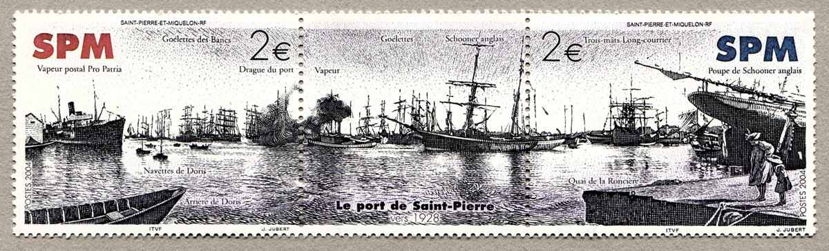 Saint-Pierre-et-Miquelon, Le port de Saint-Pierre vers 1928 : vapeur postal Pro Patria, goélettes des Bancs, dragues du port, navettes de doris, arrière de doris, Trois-mâts long courrier, poupe de schooner anglais, quai de la Roncière, 2004 (dessin et gravure de Jacques Jubert, impression taille-douce) (© La Poste SPM / J. Jubert)