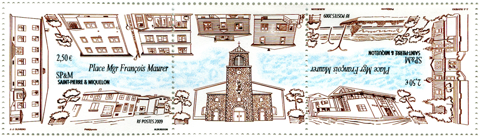 Saint-Pierre-et-Miquelon, la place Mgr François Maurer, 2009 (création Jean-Jacques Oliviéro, gravure pierre Albuisson, impression taille-douce) (© La Poste SPM / JJ. Oliviéro / P. Albuisson)