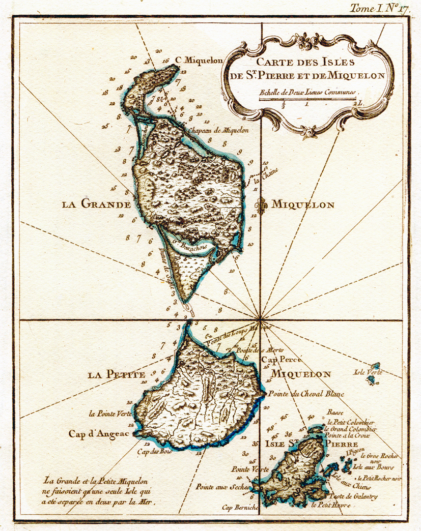 Carte de Saint-Pierre-et-Miquelon de Jacques Nicolas Belin (1703-1772), publiée en 1764 (coll. part).