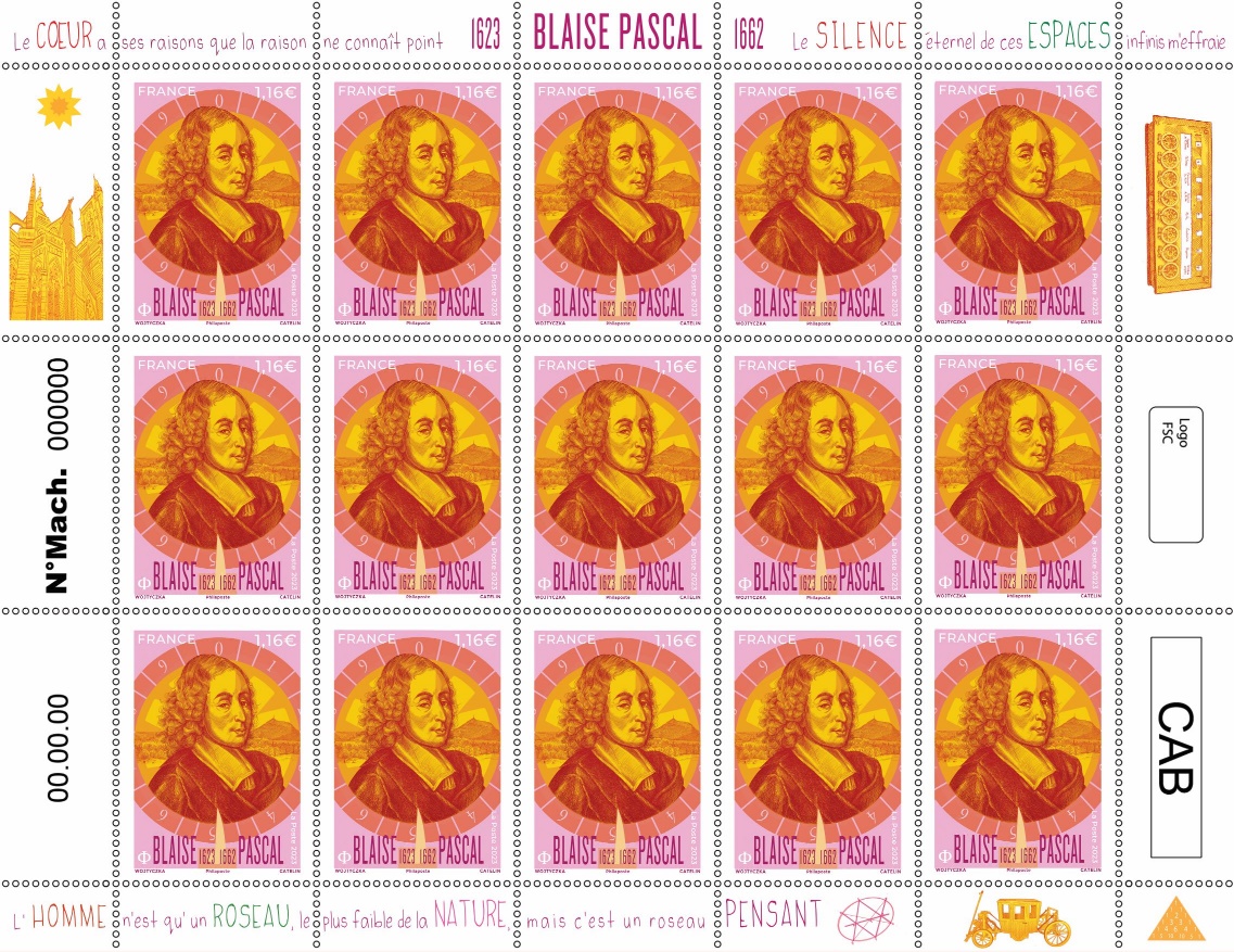A l’occasion du 400ème anniversaire de la naissance de Blaise Pascal (1623-1662), mathématicien, physicien, inventeur, philosophe, moraliste et théologien, La Poste émet un timbre à son effigie.