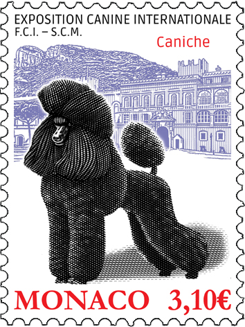 Cette année, l’exposition canine internationale se déroulera les 9 et 10 mai. Le timbre met en avant un caniche sur fond de paysage monégasque avec le Rocher et le Palais Princier.