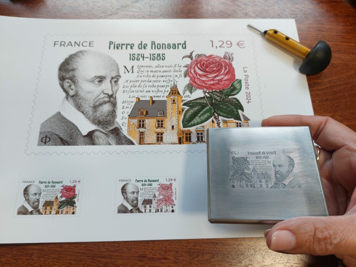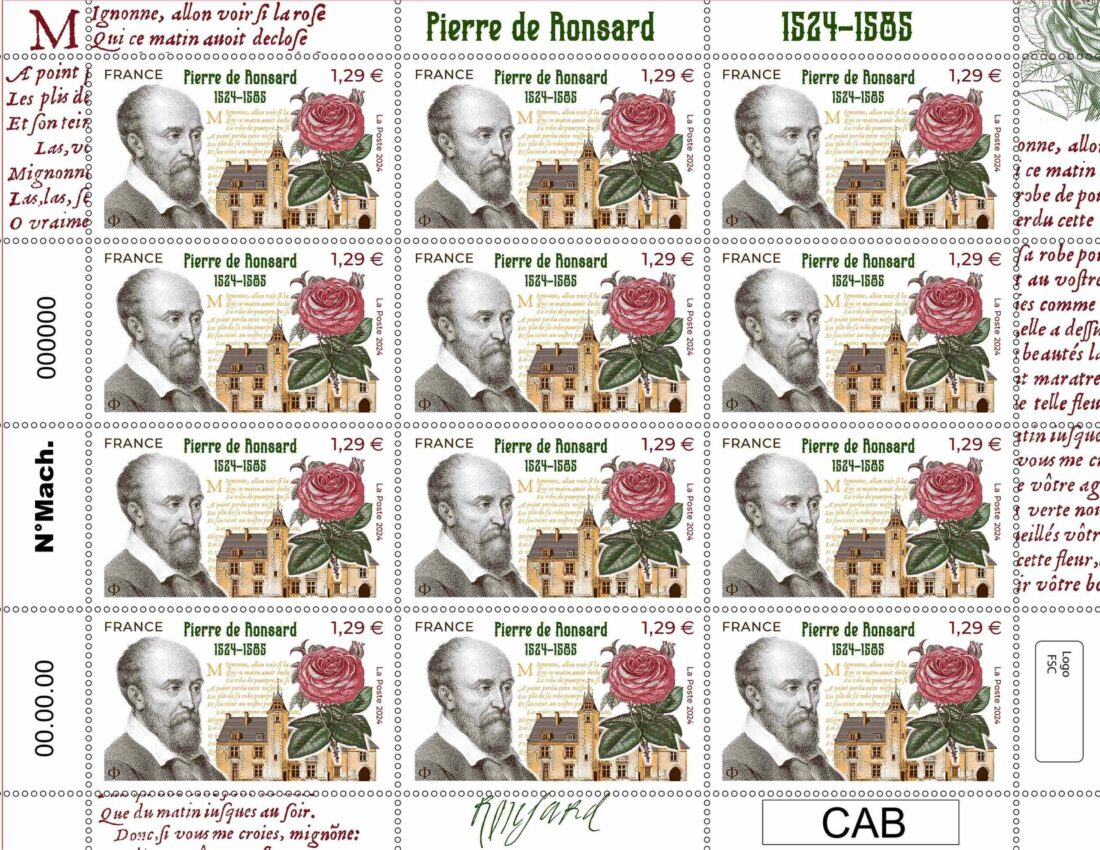 Les 11 et 12 septembre, La Poste émettra en premier jour le timbre Pierre de Ronsard dessiné et gravé par Elsa Catelin. Cent ans après l’émission d’un timbre au profit du poète, cette fois, le timbre est imprimé en taille-douce, technique d’impression qui n’était pas encore utilisée en 1924 où nous retrouvions des timbres imprimés en typographie.