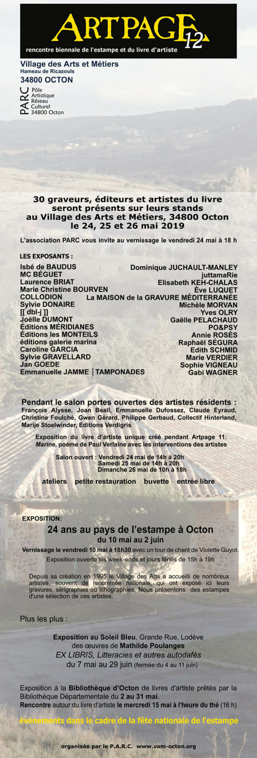 Dans le cadre de la XIIème biennale de l’estampe et du livre d’artiste, trente graveurs, éditeurs et artistes du livre seront présents au village des Arts et Métiers, à Octon, 34800 du 24 au 26 mai 2019. Eve Luquet y est présente.
