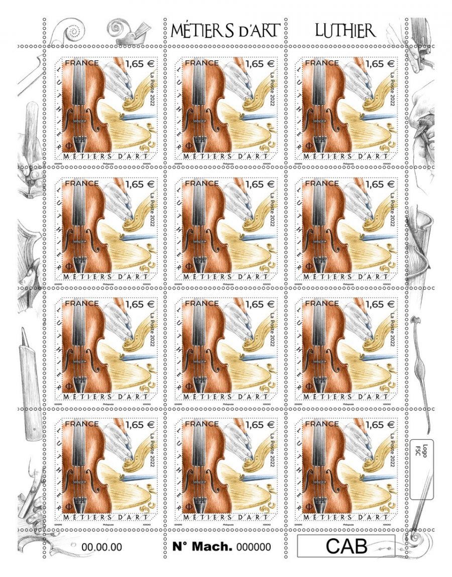 La Poste émet le 14 février un nouveau timbre dans la série des métiers d’art initiée en 2016. Le savoir-faire du luthier est mis à l’honneur. Conçu par Florence Gendre et gravé par Line Filhon, ce timbre est imprimé en taille-douce.