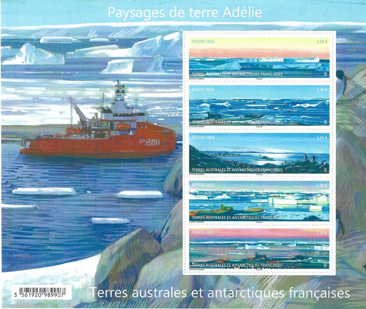 TAAF, Paysages de terre Adélie, bloc-feuillet de 5 timbres, 2023 (création de Marie Détrée, impression offset) (© TAAF / M. Détrée)