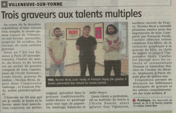 L’atelier parisien de gravure du Merle, du Brave et du Bovin expose du 26 septembre au 31 octobre « Jardins de l’Antiquité « au Musée-Galerie Carnot à Villeneuve-sur-Yonne. Cet atelier de gravure regroupe 3 artistes – graveurs issus de l’école Estienne : Louis Genty, François Feydy et Nicolas Bical. Il est à la croisée des chemins entre la gravure d’art et l’artisanat d’art. Ces 3 artistes graveurs présenteront leurs oeuvres, expliqueront leurs démarches artistiques et procéderont à des démonstrations.