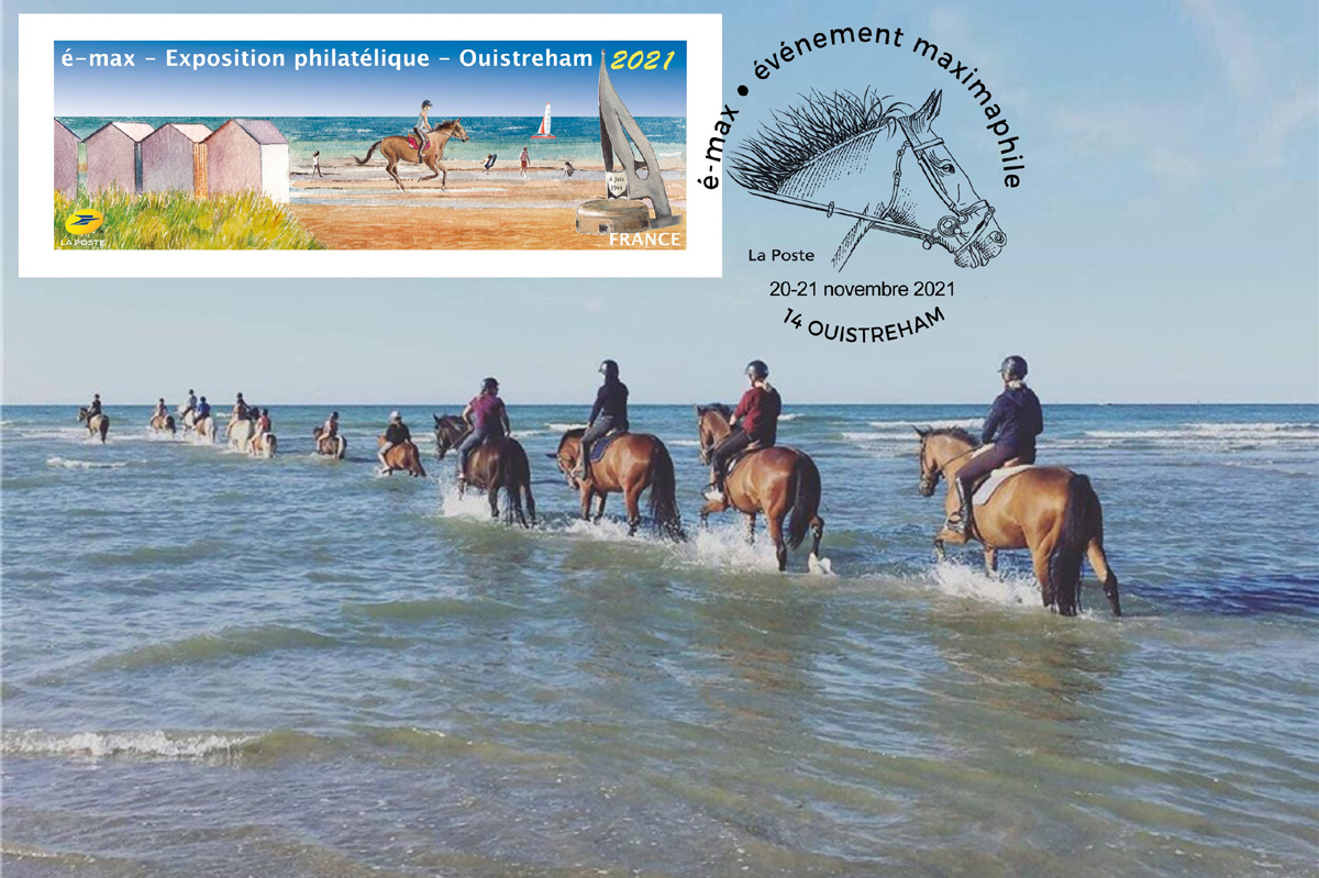 Festival Maxi-Timbré, Carte maximum « Cavaliers sur la plage de Ouistreham », 2021 (vignette Lisa, création de Claude Perchat)