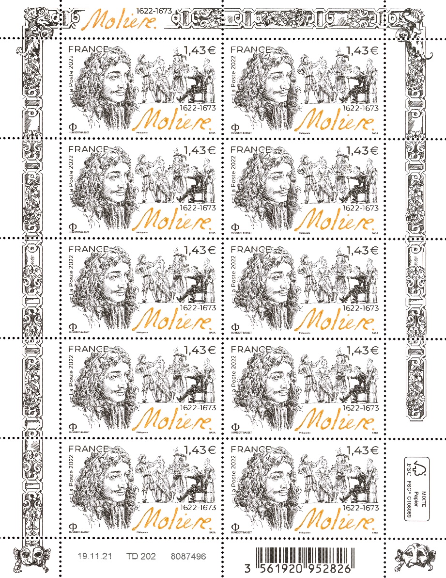 La Poste émet le 17 janvier 2022 un timbre à l’effigie de Molière (Jean-Baptiste Poquelin, dit) à l’occasion du 400ème anniversaire de sa naissance.