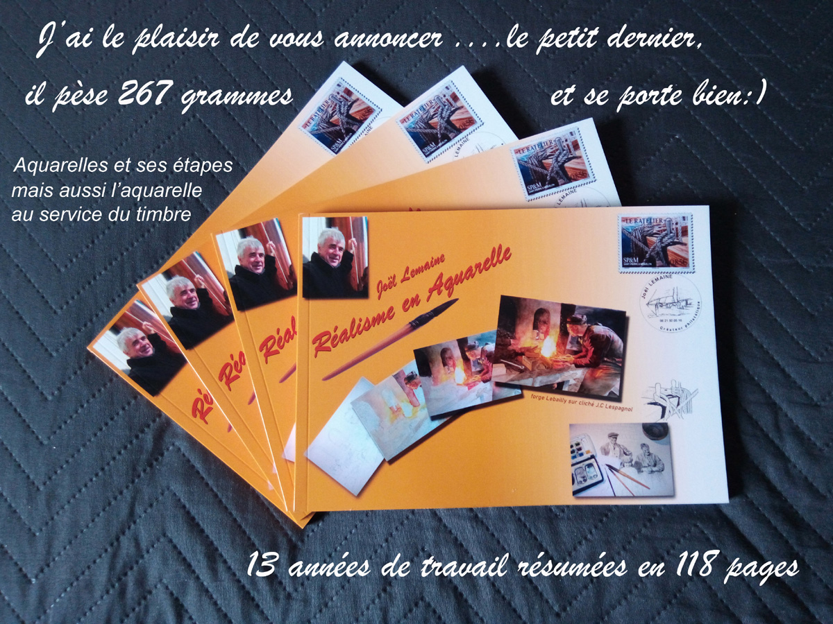 Joël Lemaine vient de publier une brochure consacrée à ses aquarelles et à treize ans d’activités artistiques. Une vingtaine de pages traitent des aquarelles liées à la philatélie : souvenirs, timbres-poste, collectors, etc.