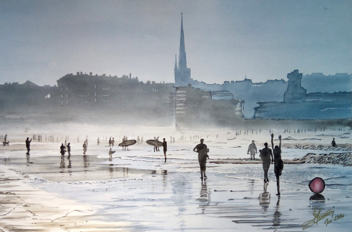 Joël Lemaine, Trois surfers malouins, aquarelle, 2018 (© J. Lemaine)