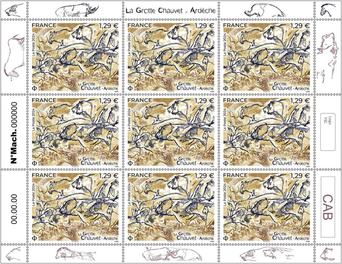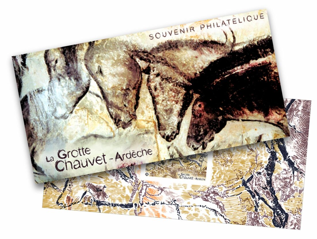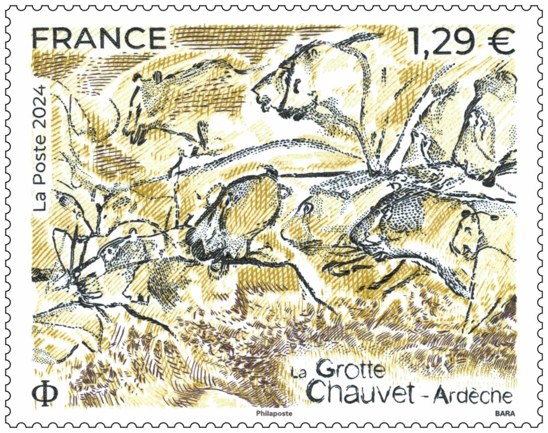 Pour concevoir ce timbre dessiné et gravé par Pierre Bara, plusieurs panneaux de la grotte ont été proposés et c’est le panneau des lions qui a été sélectionné. Sur le timbre, nous avons donc majoritairement des félins et un ours. De plus, le titre a été volontairement positionné en bas du timbre pour laisser toute sa place aux animaux et permettre ainsi un dessin plus détaillé. Nous retrouvons en taille directe le dessin fait par les hommes préhistoriques avec deux nuances de brun et un bleu gris, et en report le relief de la grotte avec un jaune ocre.