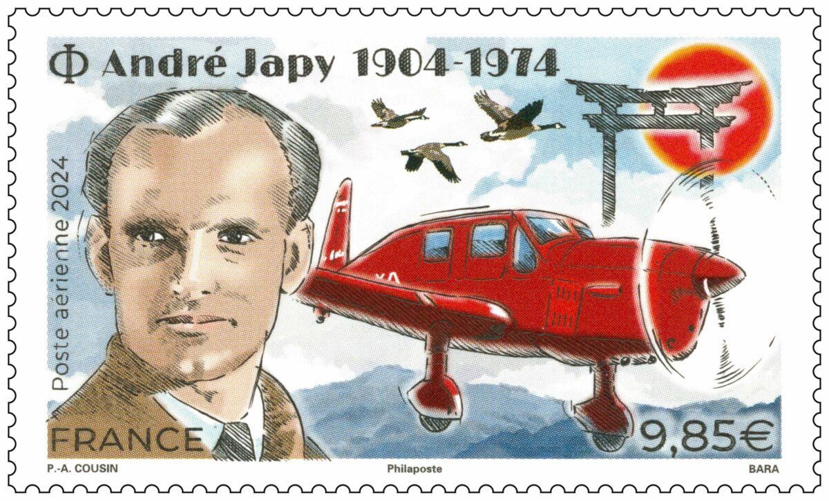 Le timbre est dessiné par Pierre-André Cousin et gravé par Pierre Bara. Nous retrouvons le portrait de l’aviateur avec des tons sépia pour donner un côté un peu ancien. L’avion d’André Japy, un Caudron-Simoun C632 est présent, survolant le Japon caractérisé par une porte Torii, le soleil levant et des oies migratrices en provenance de Sibérie. Enfin, le Mont Sefuri, lieu du crash d’André Japy en 1936 est présent dans le bas du timbre.