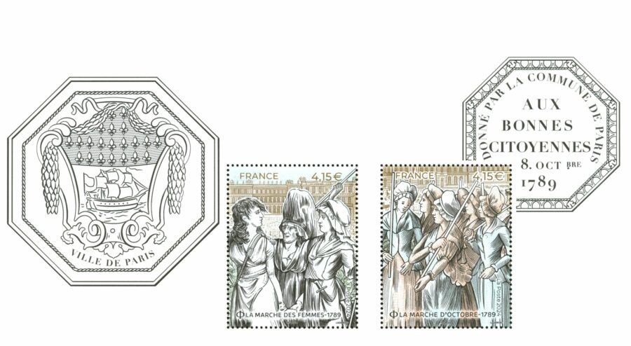 Le bloc est dessiné et gravé par Sarah Lazarevic qui a travaillé à partir de gravures et de dessins aquarellés fournis. L’idée était de représenter la marche des femmes et l’artiste a proposé d’ajouter Versailles en arrière-plan pour montrer l’objectif à atteindre. Il y a deux moments à cette scène avec deux groupes de personnages dont l’un présente un homme, car des hommes ont également participé à la marche. Nous retrouvons en taille directe du noir et le marron de Versailles, et en report du rose, du bleu et du vert. Le timbre en noir et blanc est un choix esthétique pour mettre en exergue les personnages de ce timbre.
