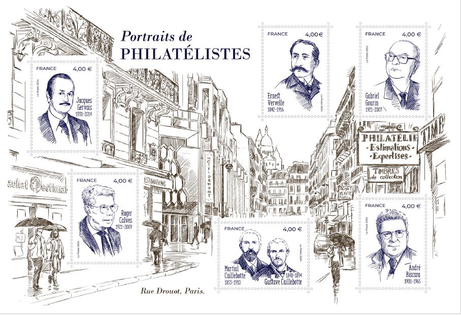 Dessiné par Stéphane Humbert-Basset et gravé par Pierre Albuisson et Elsa Catelin, ce bloc fait suite à celui de 2022 et présente six nouveaux portraits de grands philatélistes. Nous retrouvons Jacques Gervais ancien dirigeant de la société Yvert et Tellier, Roger Calves expert en philatélie, Ernest Vervelle qui a découvert une variété de 1 franc vermillon, Gabriel Gourin qui redressa la FFAP en 1978, Martial et Gustave Caillebotte qui ont constitué une belle collection philatélique, André Biscara ancien président du Groupement Philatélique du Centre Ouest.