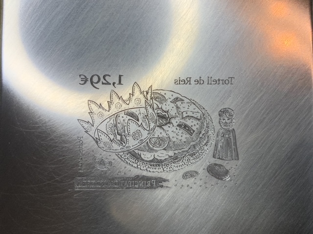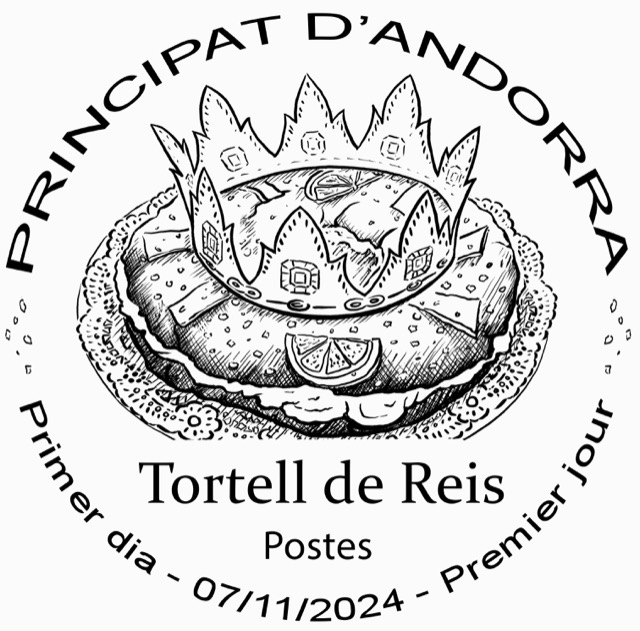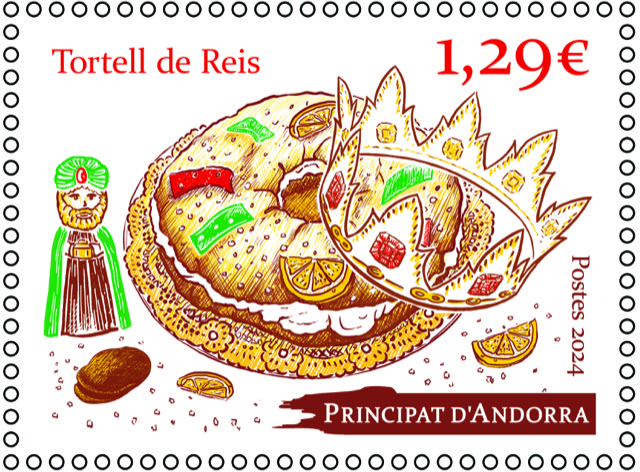 Dessiné et gravé par Line Filhon, le timbre a comme sujet la galette des rois espagnole, fourrée à la crème et avec des fruits confits. Il a été demandé à l’artiste de faire figurer les deux fèves, la fève de haricots et le roi mage, présents à gauche. Des rondelles de citron ont également été ajoutées.