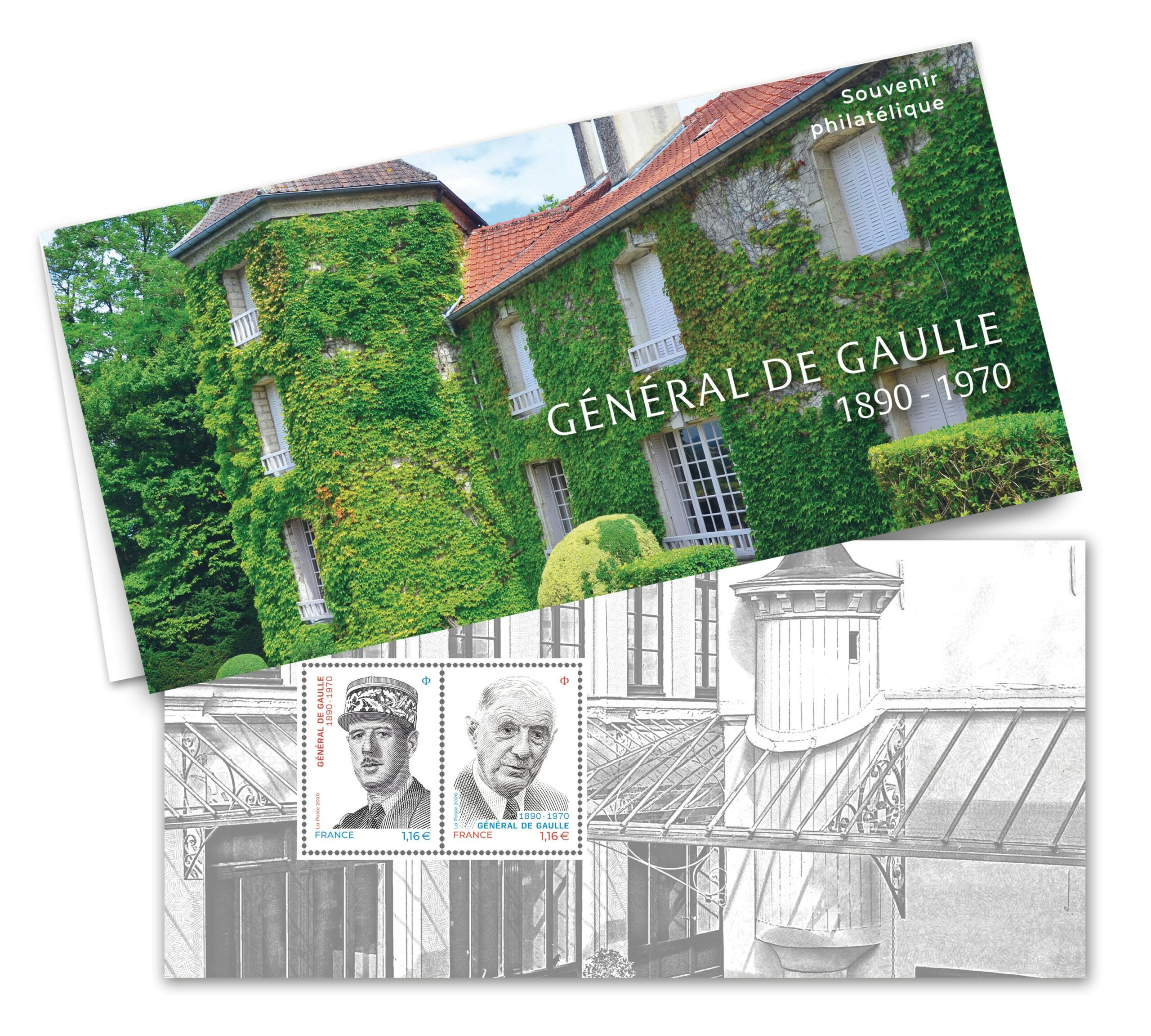 A l’occasion du cinquantenaire de la mort de Charles de Gaulle, La Poste émet le 9 novembre 2020 un diptyque (deux timbres se-tenant). La création et la gravure en taille-douce sont réalisées par Sarah Lazarevic.