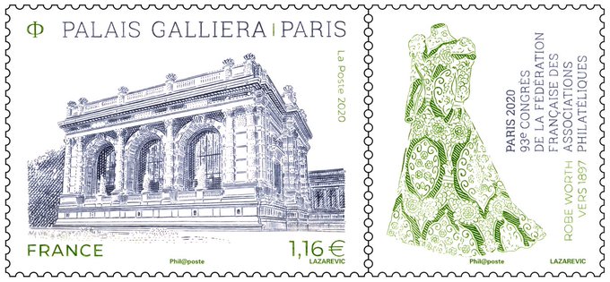 A l’occasion du congrès de la Fédération française des associations philatéliques prévu le 8 novembre 2020 (annulé à cause du confinement), La Poste émet un timbre sur Paris, Palais Galliera (aujourd’hui Musée de la mode de la Ville de Paris). Cette création philatélique de Sarah Lazarevic est imprimée en taille-douce.