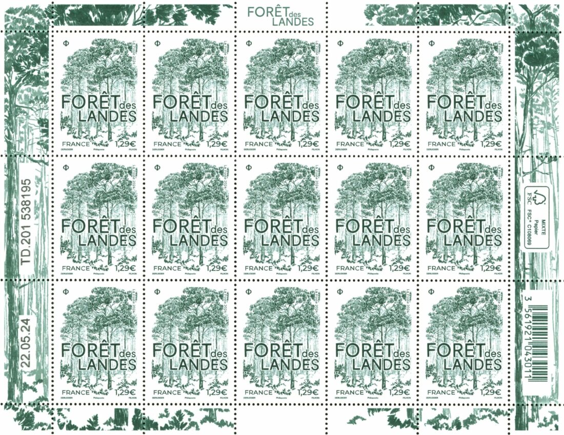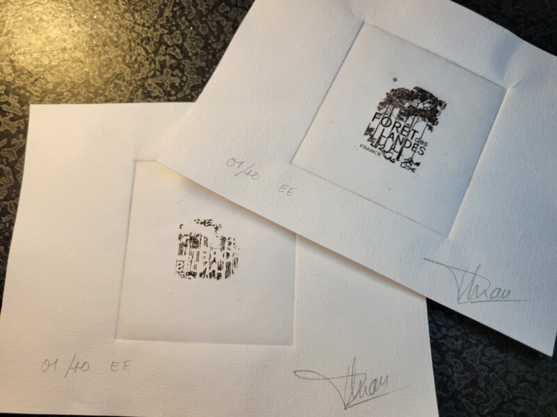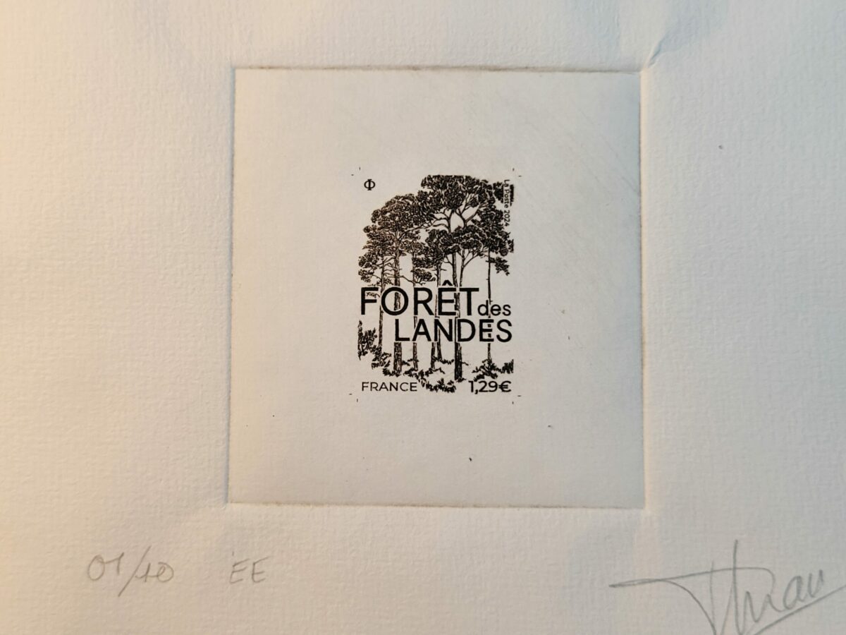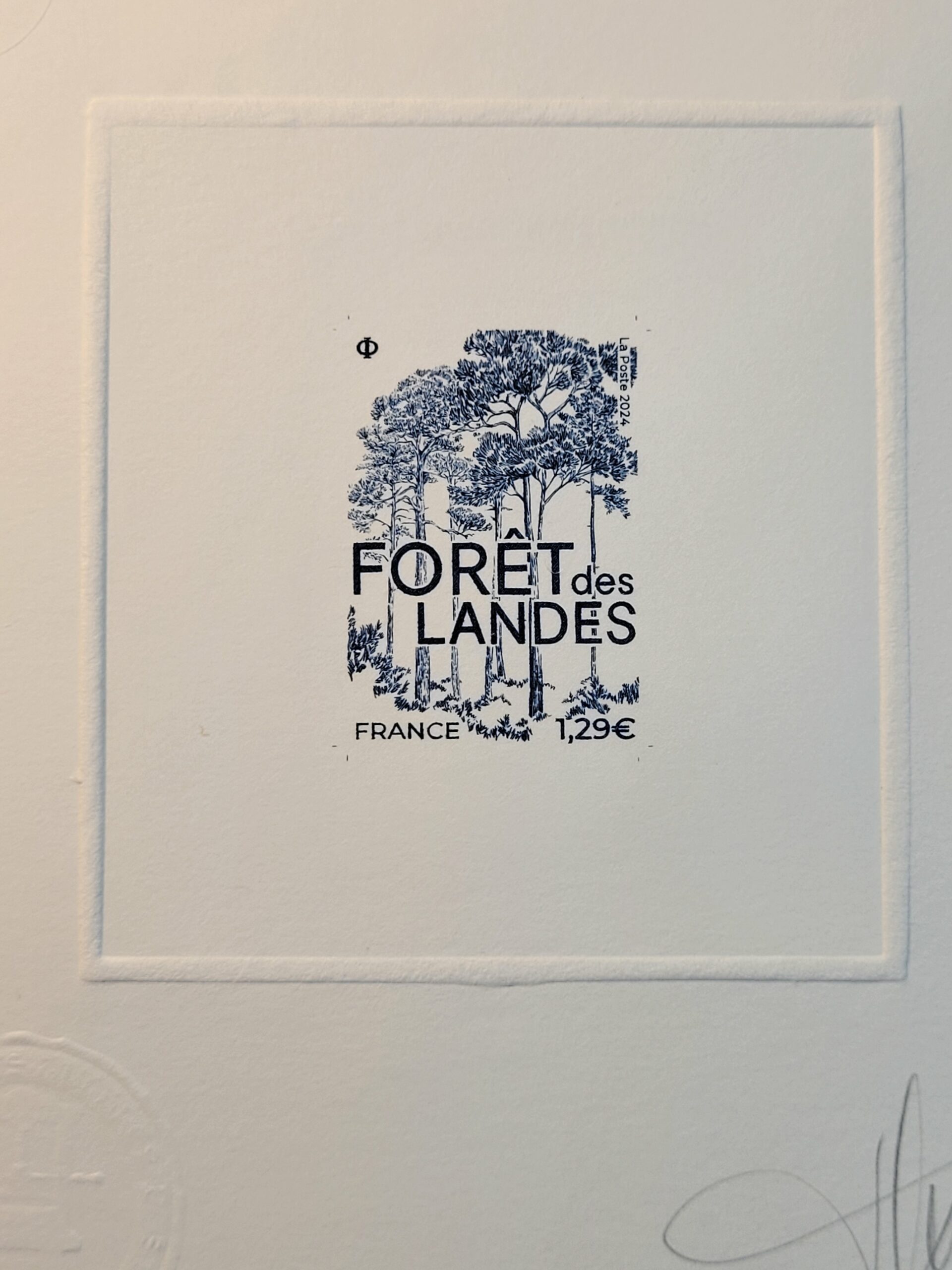 Les 12 et 13 juillets 2024, La Poste émettra en premier jour le timbre forêt des Landes dessiné par Ségolène Derudder et gravé en taille-douce par Line Filhon. L’artiste graveur animera une séance de dédicaces au Carré d’Encre le 12 juillet de 10h30 à 12h30.