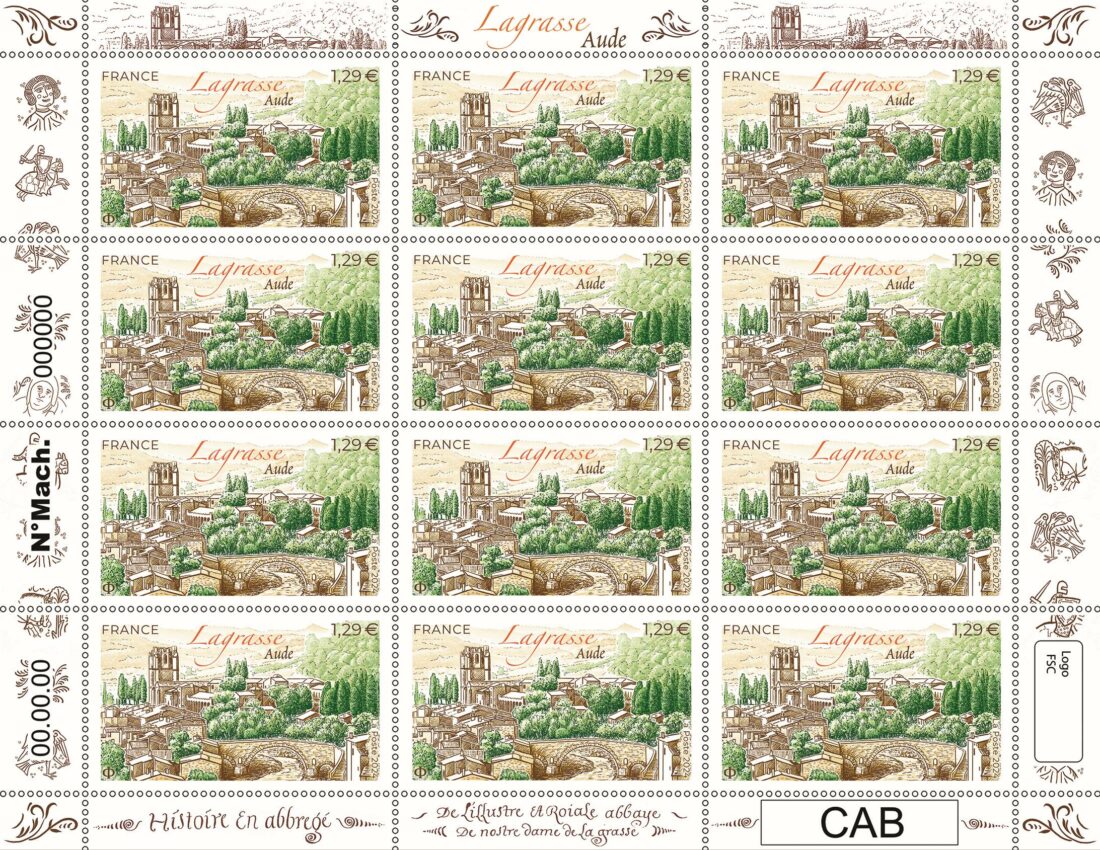 Lagrasse, village médiéval, est situé dans le sud de la France, dans l’Aude. Le timbre présente une vue panoramique de Lagrasse avec une perception de profondeur donnée par les montagne dans le fond. Nous retrouvons deux emblèmes du village, le pont de l’Abbaye, par lequel se faisait l’accès au village pendant la période médiévale, et l’Abbaye Sainte-Marie derrière le pont. Il a été demandé à l’artiste de présenter une vue d’ensemble du village avec ces deux emblèmes, au sein du bâtit et de la verdure.