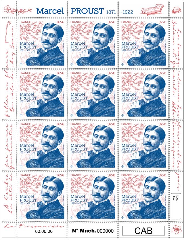 Le 25 juillet 2022, La Poste émet un timbre et un souvenir philatélique à l’effigie de Marcel Proust (1871-1922) à l’occasion du centenaire de sa mort. Ce timbre est dessiné et gravé en taille-douce par Sophie Beaujard.