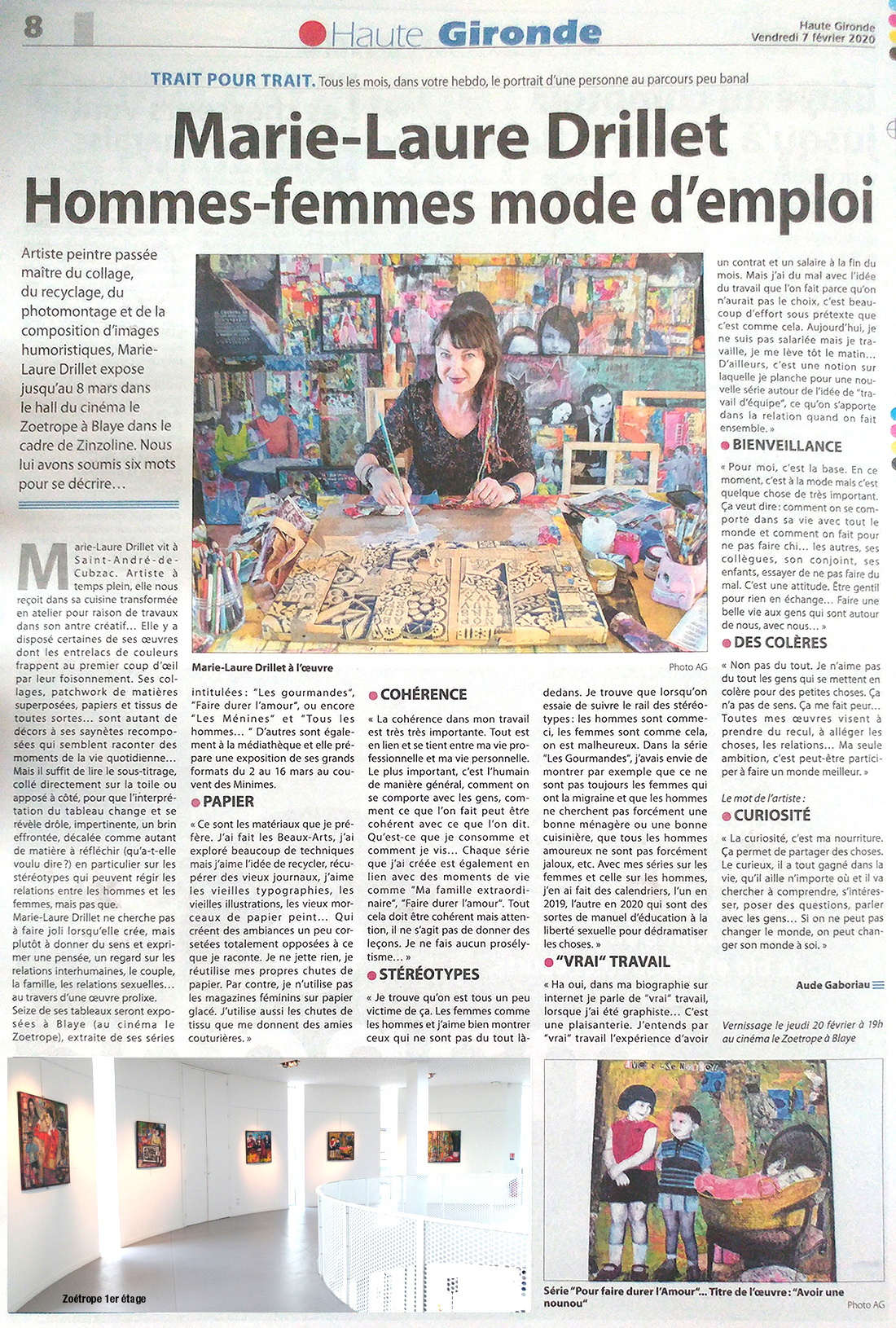 Journal Haute Gironde, hebdo, « Marie-Laure Drillet. Hommes – femmes mode d’emploi », 7 février 2020, p.8 (© Haute Gironde)