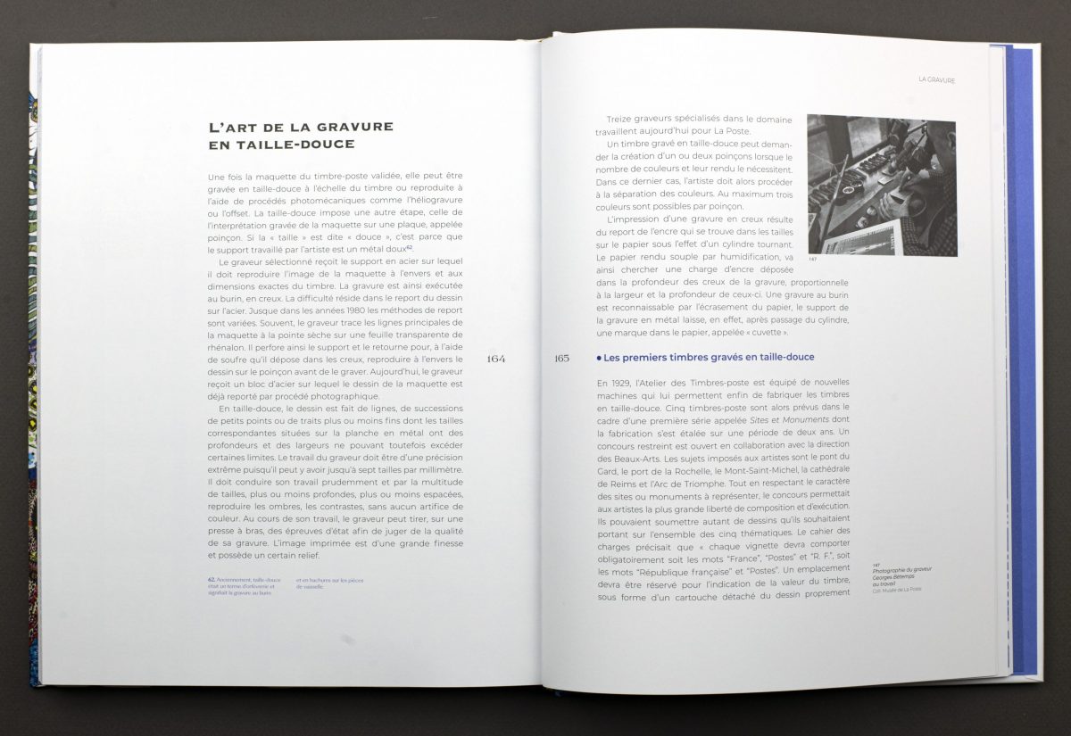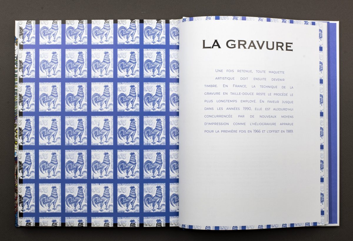 Cette œuvre d’art miniature, également objet du quotidien, dévoile donc tous ses secrets dans le catalogue, aussi bien du point de vue technique qu’artistique. Un focus sur la gravure en taille-douce est également proposé. Enfin, un chapitre sur l’impression des timbres met en avant la singularité de l’imprimerie des timbres-poste de Philaposte, située à Boulazac, et qui vient de fêter ses cinquante ans.
