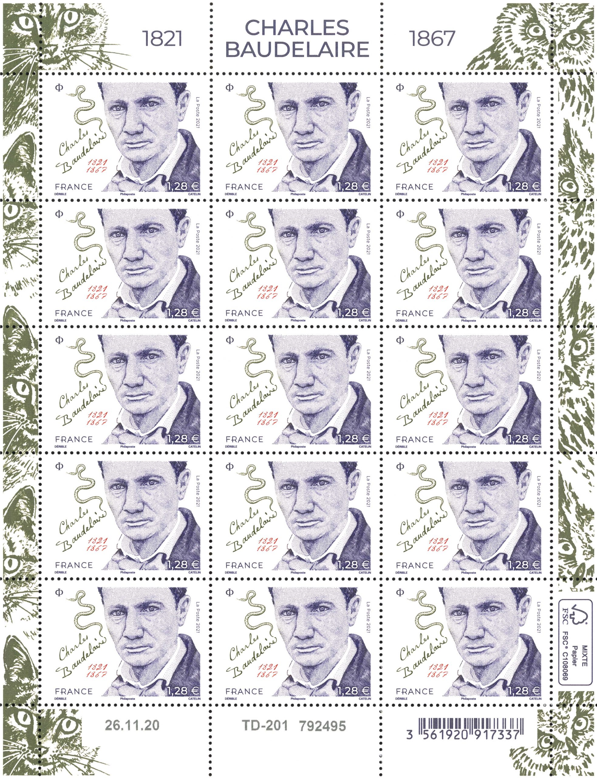 La Poste émet le 12 avril 2021 un timbre à l’effigie de Charles Baudelaire (1821-1867) à l’occasion du bicentenaire de sa naissance.