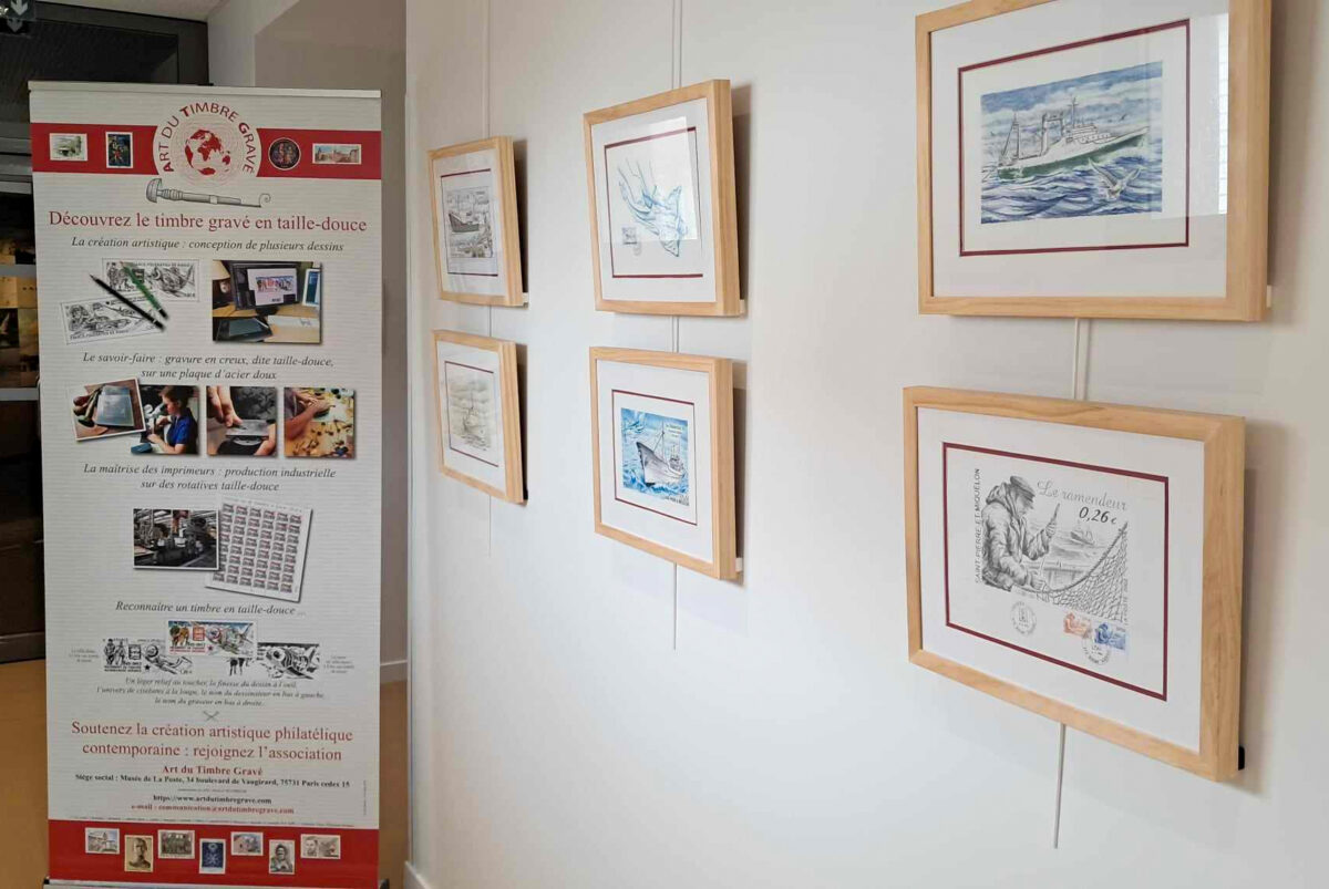 L’exposition présente des croquis, des travaux préparatoires, des séparations de couleurs, des détails et aussi des maquettes finales. Ce sont des originaux de projets de timbres destinés à la gravure en taille-douce. C’est à dire que ces illustrations ont été reprises par des graveurs qui les ont interprétées le plus fidèlement possible à l’échelle du timbre-poste avant l’impression. Sur la quinzaine de timbres de Saint-Pierre-et-Miquelon émis chaque année, 40 % sont imprimés en taille-douce, le reste s’effectuant en offset.