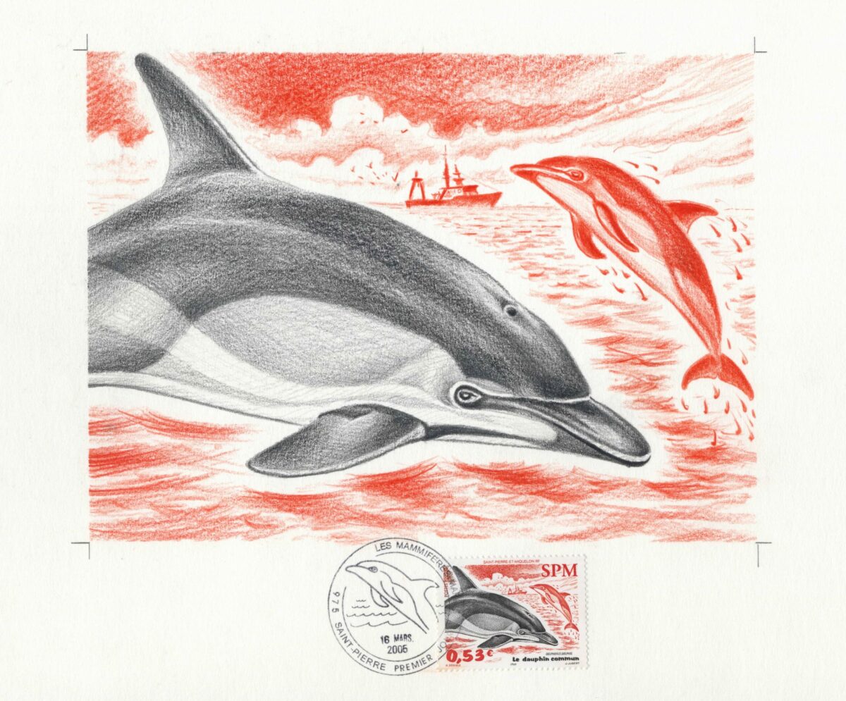 Patrick Dérible, le dauphin commun, maquette du timbre, 2005 (© P. Dérible)