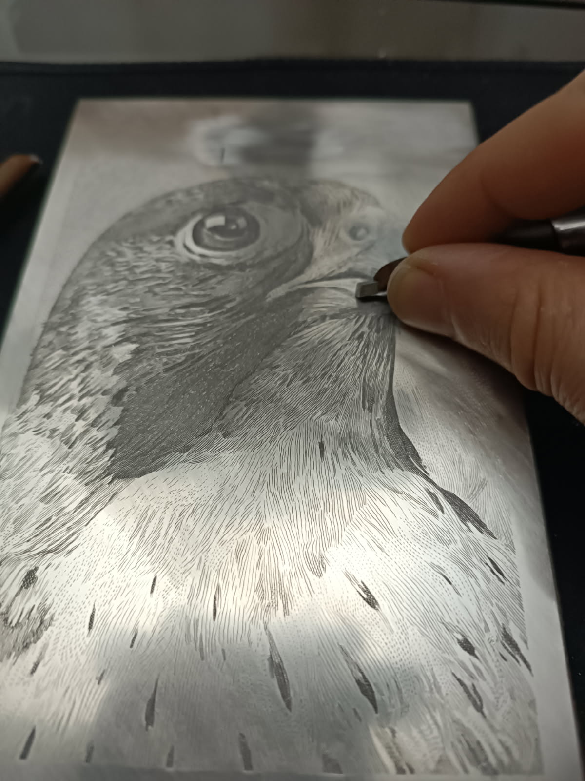 Pierre Bara en cours de gravure, le faucon pélerin, détail, ATG 2025(© P. Bara)