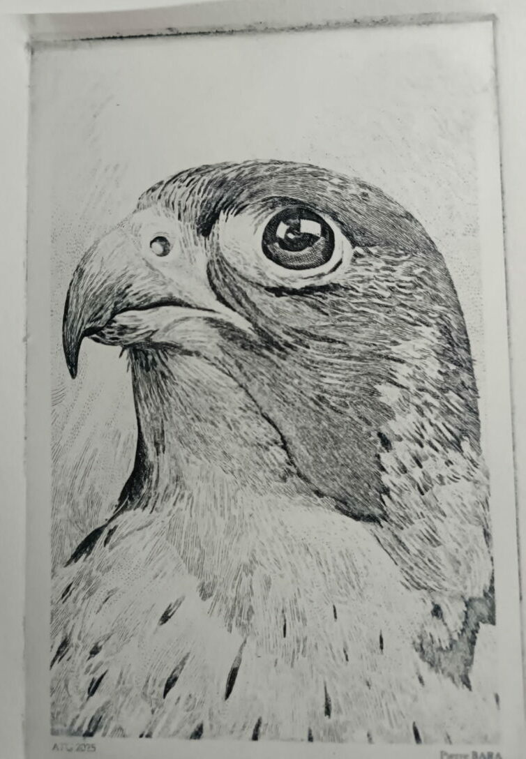 Pierre Bara, le faucon pèlerin, épreuve de gravure, ATG 2025 (© P. Bara)