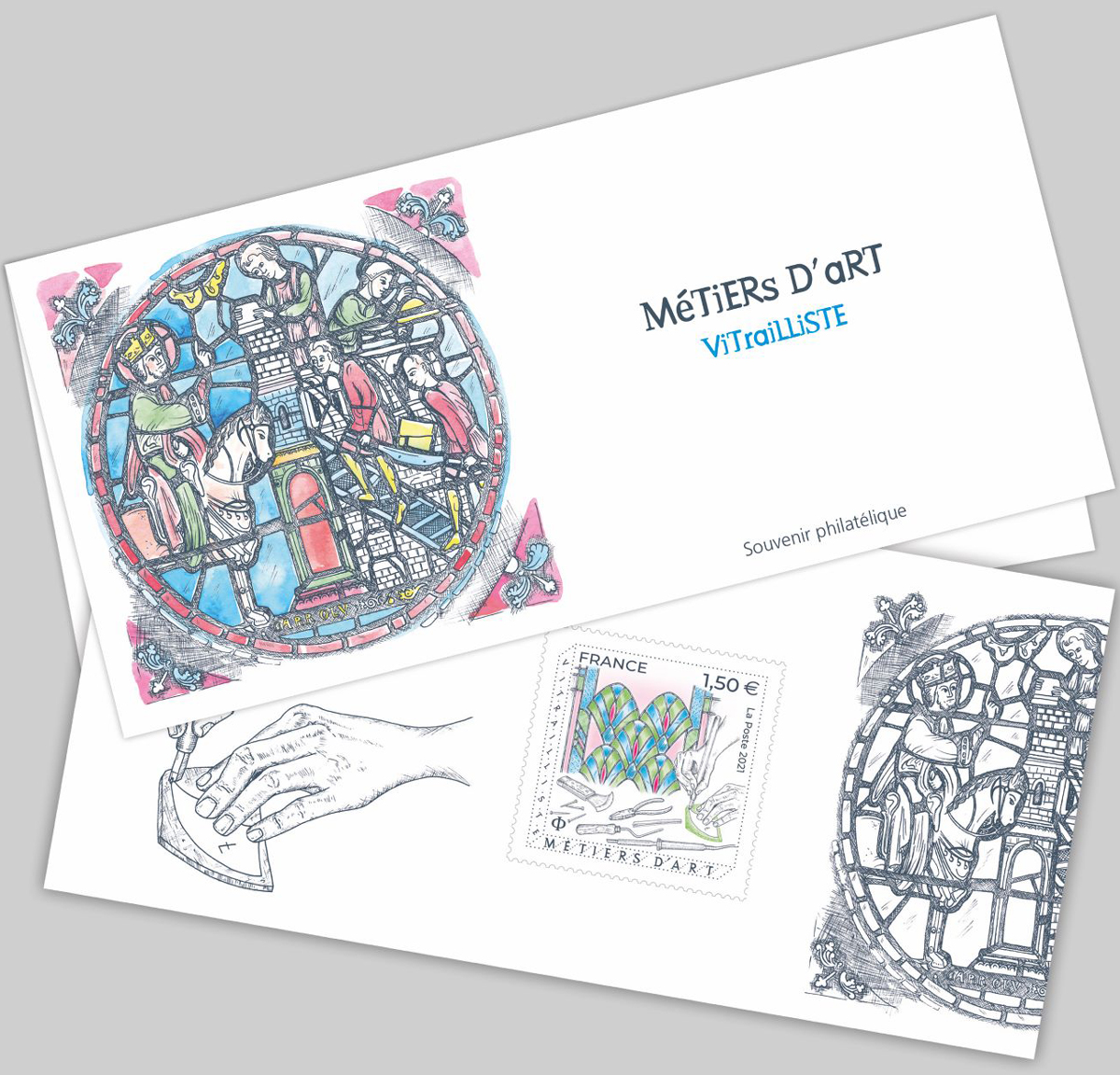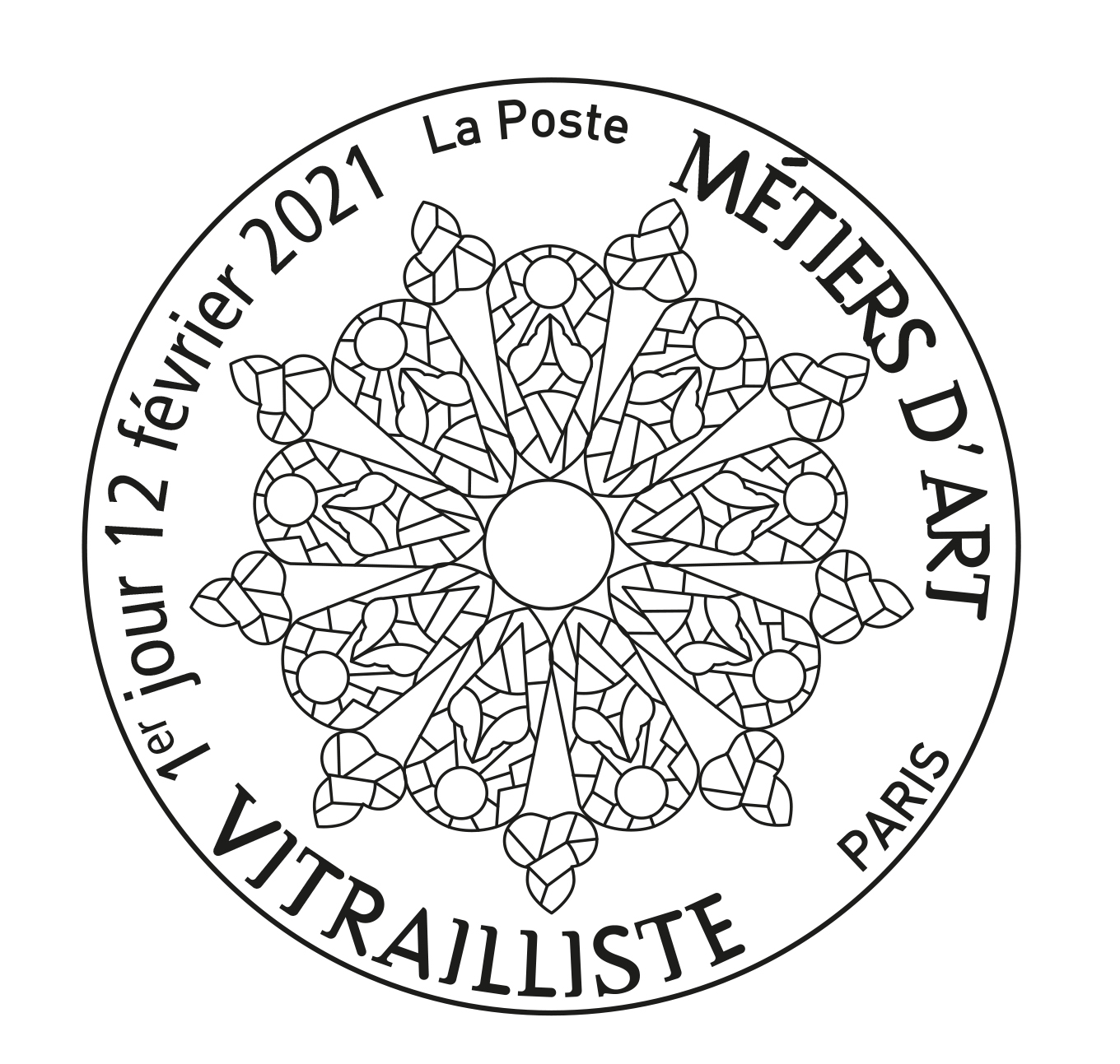 Dans la série des métiers d’art initiée en 2016, La Poste émet le 12 février un timbre à l’honneur du savoir-faire du vitrailliste. Ce timbre conçu par Sandrine Chimbaud est gravé en taille-douce par Pierre Albuisson.