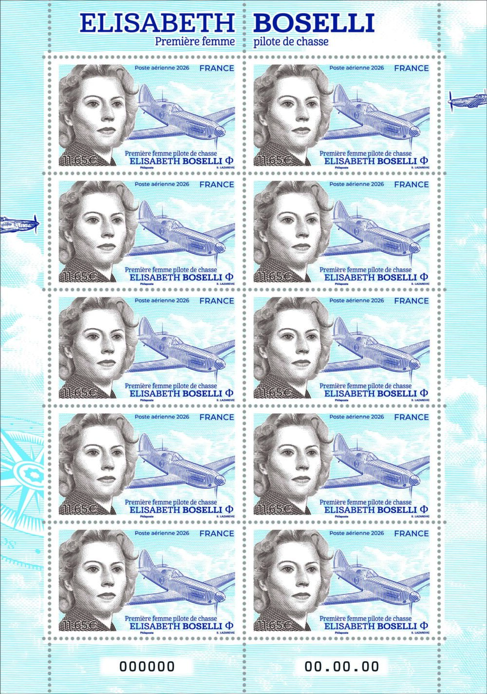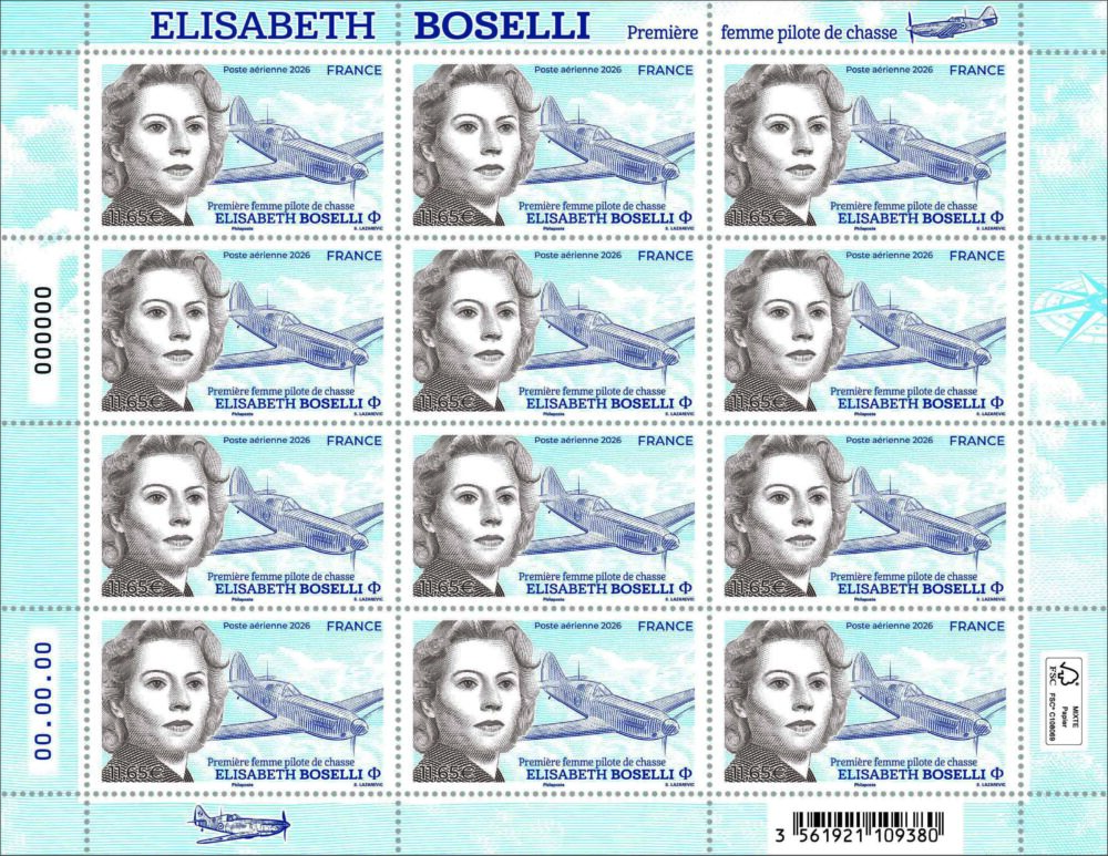 Née en 1914 à Paris et décédée en 2005 à Lyon, Elisabeth Boselli est la première femme pilote de chasse de l’Armée de l’Air. Elle obtient en 1946 son brevet de pilote militaire et bat plusieurs records sur chasseur Mistral durant sa carrière. Le portrait de l’aviatrice est mis en avant sur le timbre ainsi que son chasseur Dewoitine D.520.