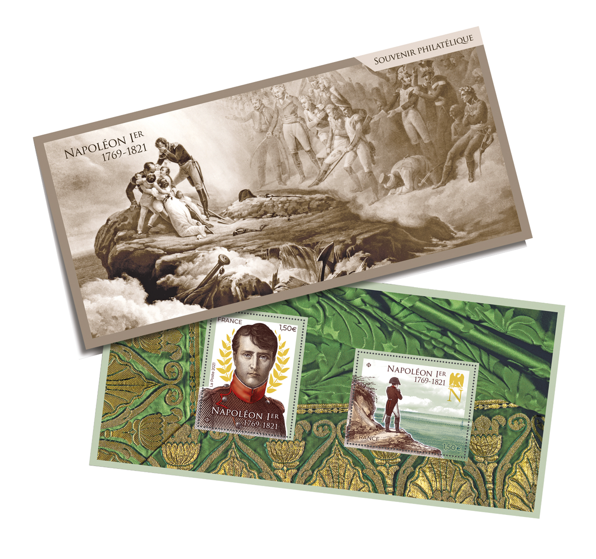 La Poste émet un bloc de deux timbres à l’occasion du bicentenaire de la mort de Napoléon Ier. Cette création de Sophie Beaujard et gravée en taille-douce est composée de deux timbres au tarif de la lettre internationale. Il sera émis le 19 avril 2021.