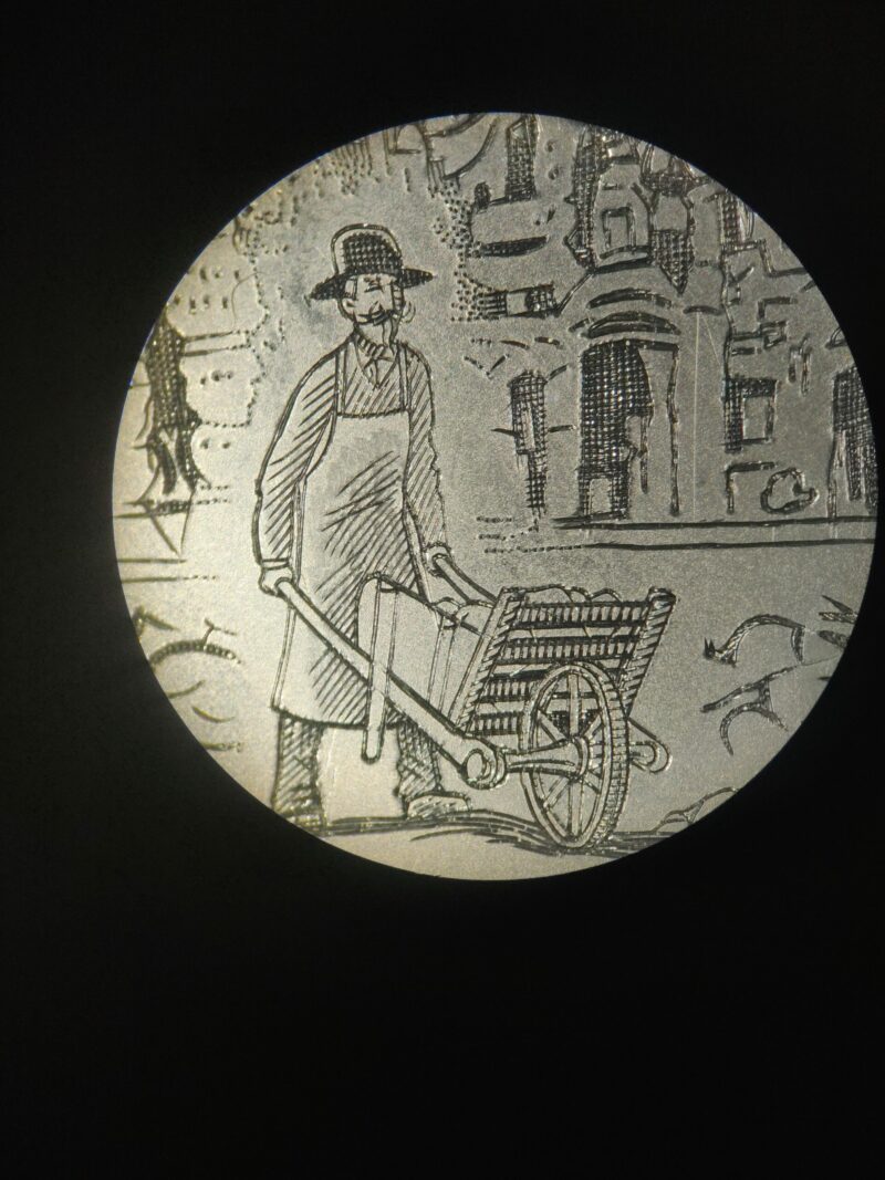 Le bloc souhaite également évoquer la construction du palais avec le Facteur Cheval portant son tablier et poussant sa brouette dans laquelle il rassemble les pierres nécessaires à la construction.