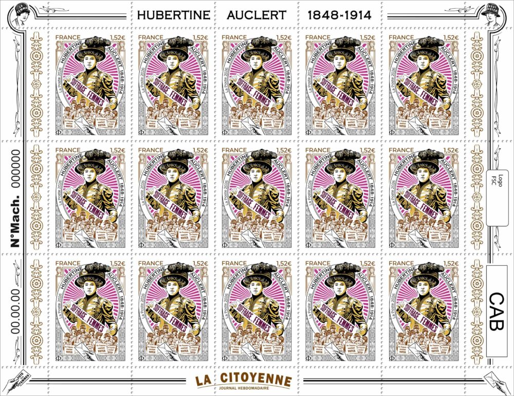 Les 17 et 18 avril, La Poste émettra en premier jour le timbre Hubertine Auclert, dessiné et gravé par Sophie Beaujard. L’artiste animera une séance de dédicaces à la salle des Fêtes de Moulins, 1 place Maréchal de Lattre de Tassigny 03190 Moulins.