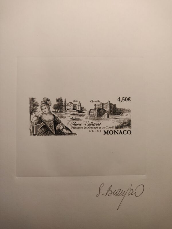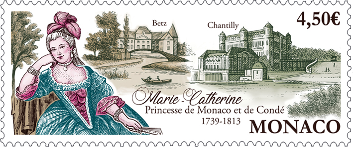 A l’occasion de l’exposition sur la princesse organisée au château de Chantilly, un timbre en taille-douce lui est consacré cette année. Marie-Catherine de Brignole-Sale épouse Honoré III de Monaco en 1757. Face au comportement jaloux et tyrannique de son époux, Marie-Catherine demande une séparation de corps et de biens obtenue en 1770. La princesse passe alors sa vie avec le prince de Condé, propriétaire du château de Chantilly et entreprend de grands travaux artistiques, notamment au château de Betz. La Révolution française pousse les deux amants à l’exil à travers l’Europe, puis en Angleterre où elle meurt en 1813.
